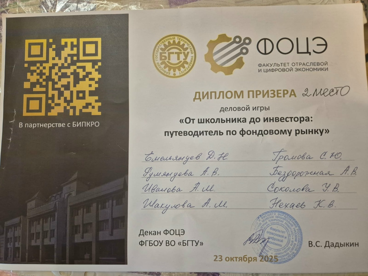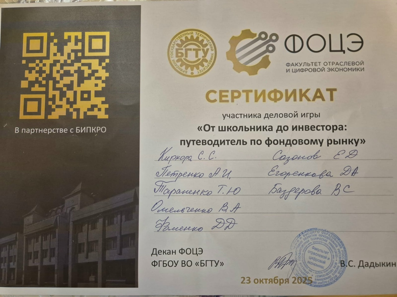 23 октября студенты Брянского техникума управления и бизнеса приняли участие в деловой игре “От школьника до инвестора” на базе факультета отраслевой и цифровой экономики ФГБОУ ВО “БГТУ”.