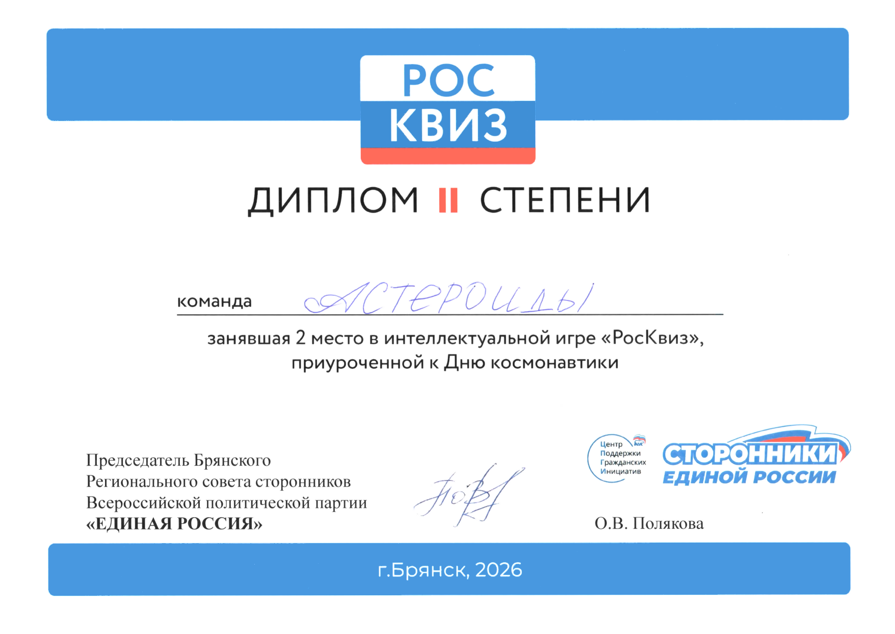 По результатам всех этапов викторины наша команда АСТЕРОИДЫ награждена Дипломом II степени.